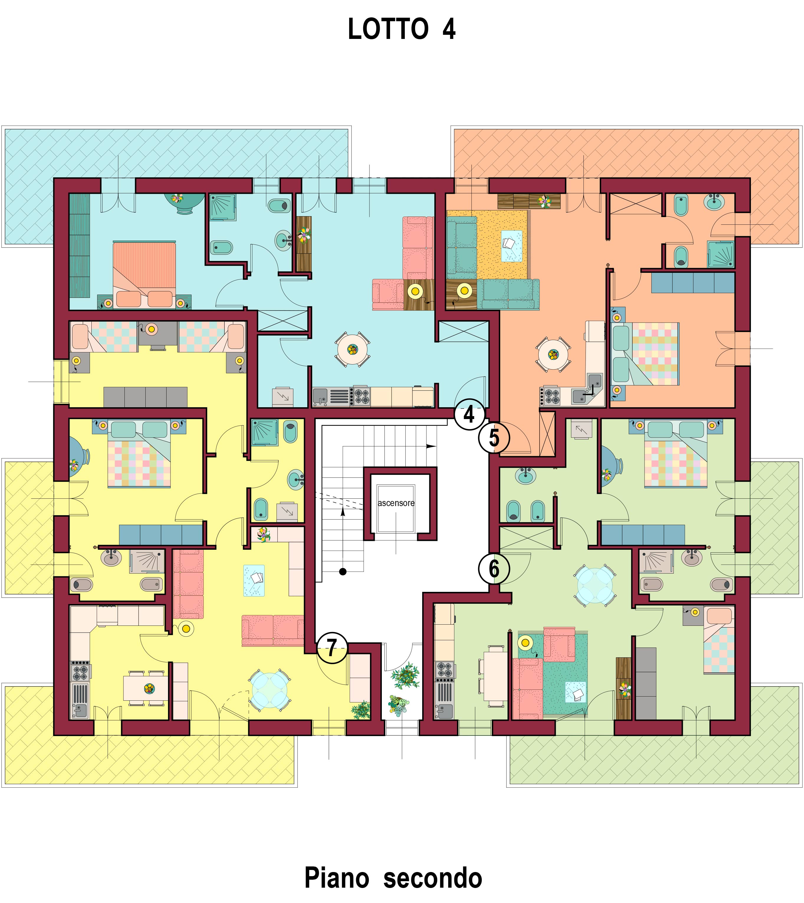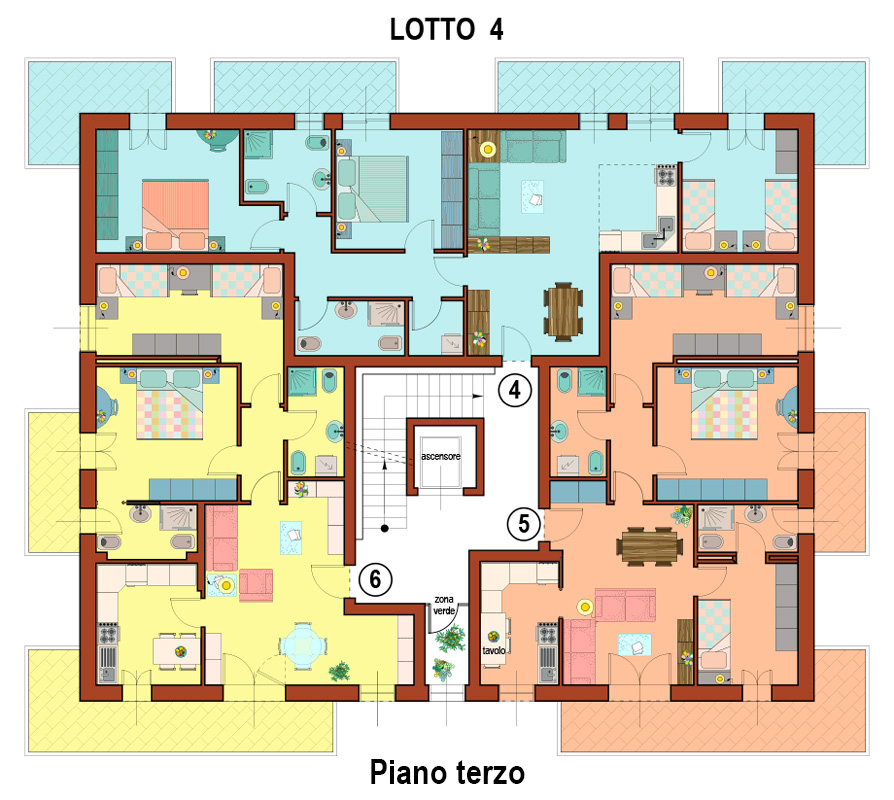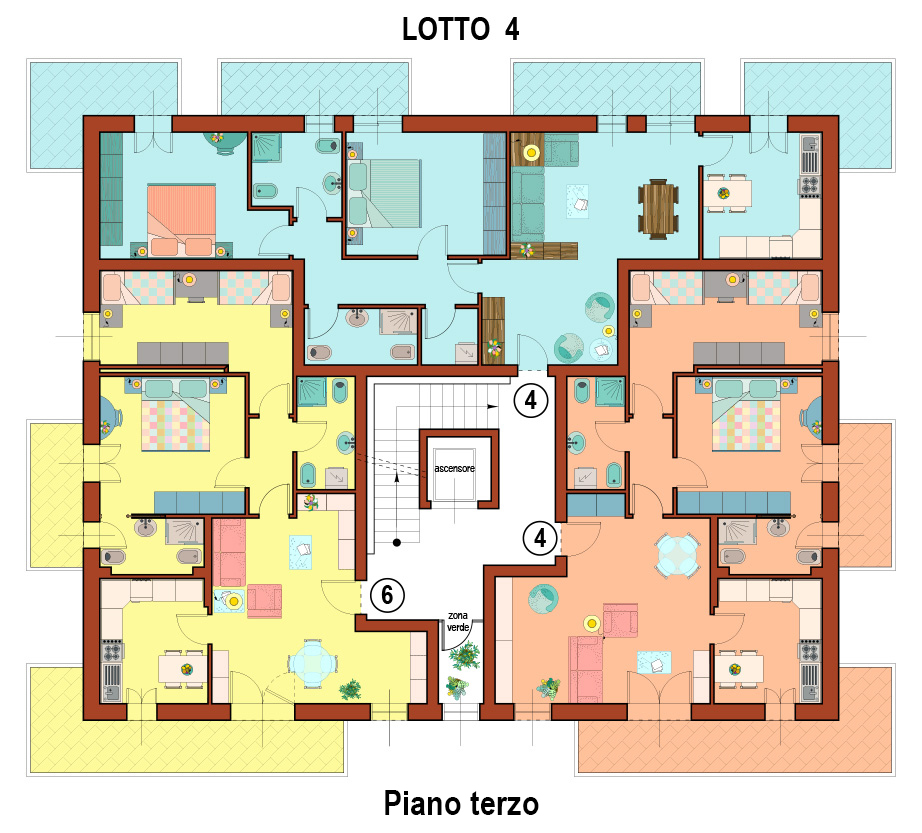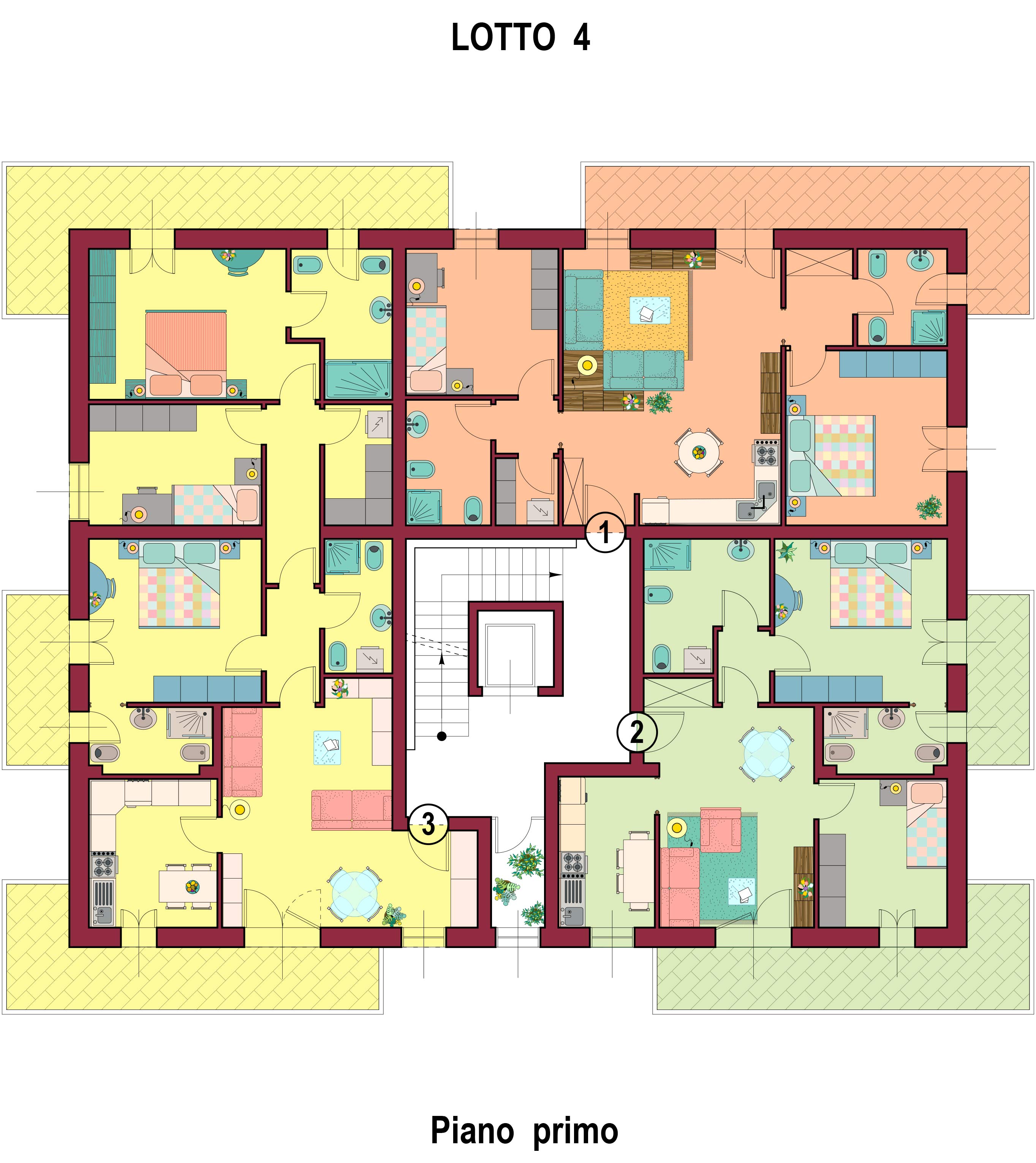 Il lotto 4 è un condominio di 3 piani di 9 appartamenti, composti di 3 vani più servizi.